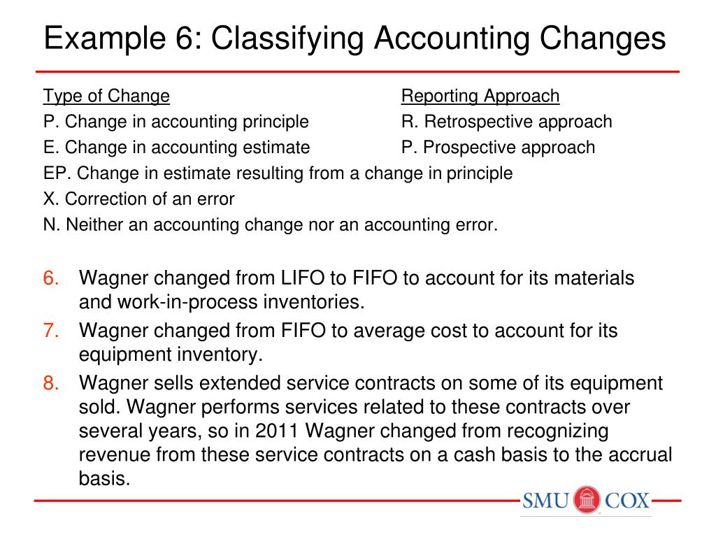 Example 6: Classifying Accounting Changes Type of ChangeReporting Approach P. Change in accounting principle R. Retrospective approach E. Change in accounting estimate P. Prospective approach EP. Change in estimate resulting from a change in principle X. Correction of an error N. Neither an accounting change nor an accounting error. • Wagner changed from LIFO to FIFO to account for its materials and work-in-process inventories. • Wagner changed from FIFO to average cost to account for its equipment inventory. • Wagner sells extended service contracts on some of its equipment sold. Wagner performs services related to these contracts over several years, so in 2011 Wagner changed from recognizing revenue from these service contracts on a cash basis to the accrual basis.
