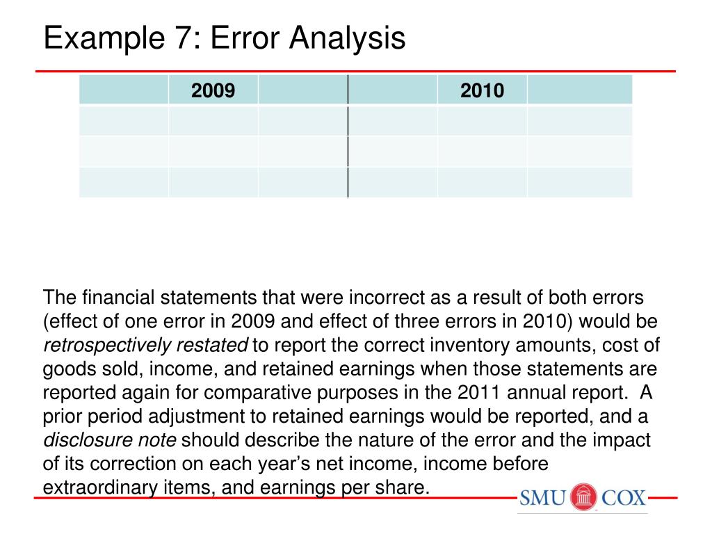 Example 7: Error Analysis The financial statements that were incorrect as a result of both errors (effect of one error in 2009 and effect of three errors in 2010) would be retrospectively restated to report the correct inventory amounts, cost of goods sold, income, and retained earnings when those statements are reported again for comparative purposes in the 2011 annual report. A prior period adjustment to retained earnings would be reported, and a disclosure note should describe the nature of the error and the impact of its correction on each year’s net income, income before extraordinary items, and earnings per share.