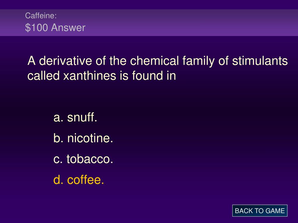 Caffeine:$100 Question • A derivative of the chemical family of stimulants called xanthines is found in • a. snuff. • b. nicotine. • c. tobacco. • d. coffee. ANSWER BACK TO GAME