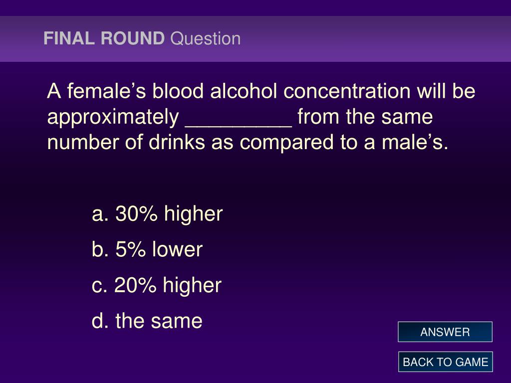 FINAL ROUND Question • A female’s blood alcohol concentration will be approximately _________ from the same number of drinks as compared to a male’s. • a. 30% higher • b. 5% lower • c. 20% higher • d. the same ANSWER BACK TO GAME