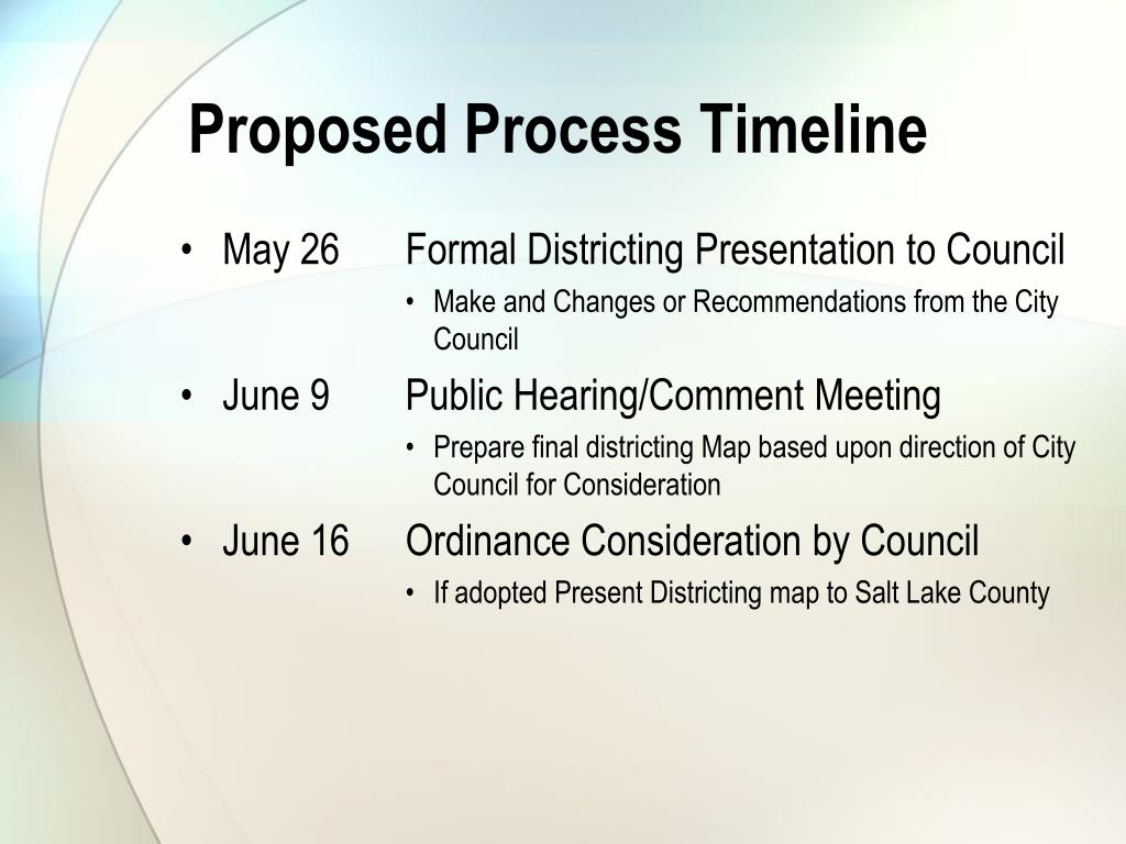 Proposed Process Timeline • May 26 Formal Districting Presentation to Council • Make and Changes or Recommendations from the City Council • June 9 Public Hearing/Comment Meeting • Prepare final districting Map based upon direction of City Council for Consideration • June 16 Ordinance Consideration by Council • If adopted Present Districting map to Salt Lake County