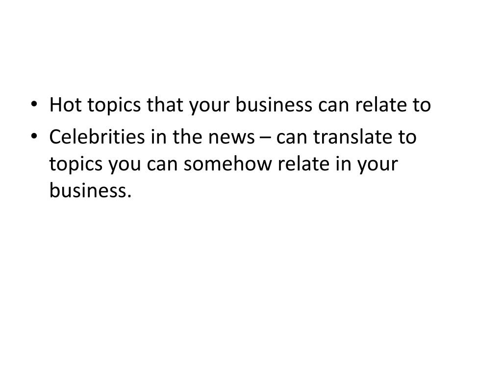 Hot topics that your business can relate to • Celebrities in the news – can translate to topics you can somehow relate in your business.