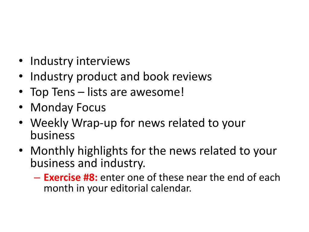 Industry interviews • Industry product and book reviews • Top Tens – lists are awesome! • Monday Focus • Weekly Wrap-up for news related to your business • Monthly highlights for the news related to your business and industry. • Exercise #8: enter one of these near the end of each month in your editorial calendar.
