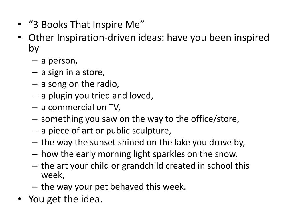 “3 Books That Inspire Me” • Other Inspiration-driven ideas: have you been inspired by • a person, • a sign in a store, • a song on the radio, • a plugin you tried and loved, • a commercial on TV, • something you saw on the way to the office/store, • a piece of art or public sculpture, • the way the sunset shined on the lake you drove by, • how the early morning light sparkles on the snow, • the art your child or grandchild created in school this week, • the way your pet behaved this week. • You get the idea.