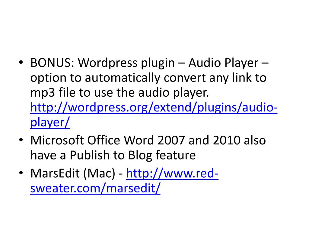 BONUS: Wordpress plugin – Audio Player – option to automatically convert any link to mp3 file to use the audio player. http://wordpress.org/extend/plugins/audio-player/ • Microsoft Office Word 2007 and 2010 also have a Publish to Blog feature • MarsEdit (Mac) - http://www.red-sweater.com/marsedit/