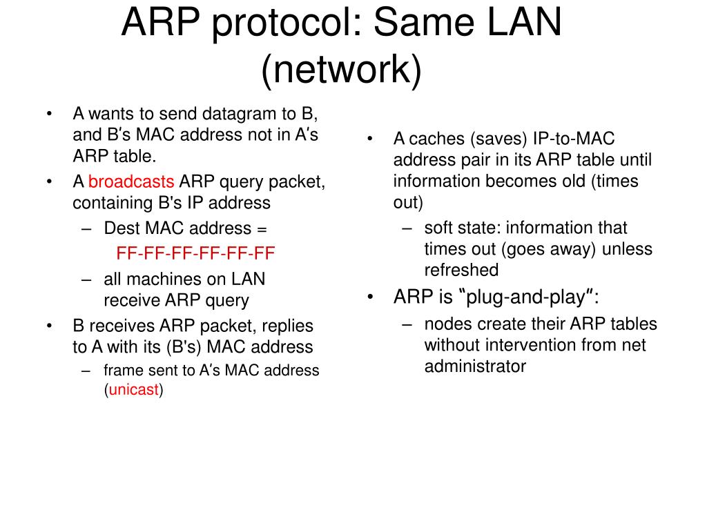 A wants to send datagram to B, and B’s MAC address not in A’s ARP table. A broadcasts ARP query packet, containing B's IP address Dest MAC address = FF-FF-FF-FF-FF-FF all machines on LAN receive ARP query B receives ARP packet, replies to A with its (B's) MAC address frame sent to A’s MAC address (unicast) A caches (saves) IP-to-MAC address pair in its ARP table until information becomes old (times out) soft state: information that times out (goes away) unless refreshed ARP is “plug-and-play”: nodes create their ARP tables without intervention from net administrator ARP protocol: Same LAN (network)