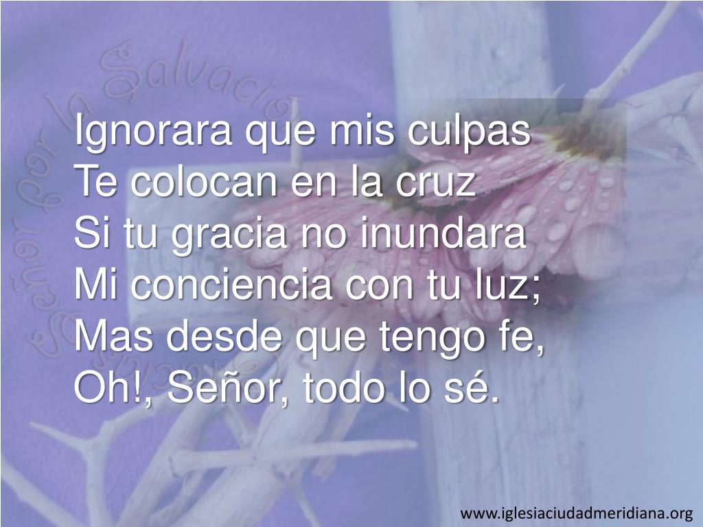 Ignorara que mis culpasTe colocan en la cruzSi tu gracia no inundaraMi conciencia con tu luz;Mas desde que tengo fe,Oh!, Señor, todo lo sé. www.iglesiaciudadmeridiana.org