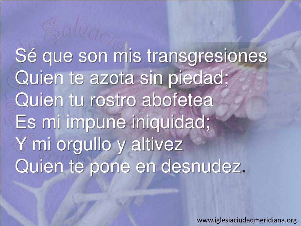 Sé que son mis transgresionesQuien te azota sin piedad;Quien tu rostro abofeteaEs mi impune iniquidad;Y mi orgullo y altivezQuien te pone en desnudez. www.iglesiaciudadmeridiana.org