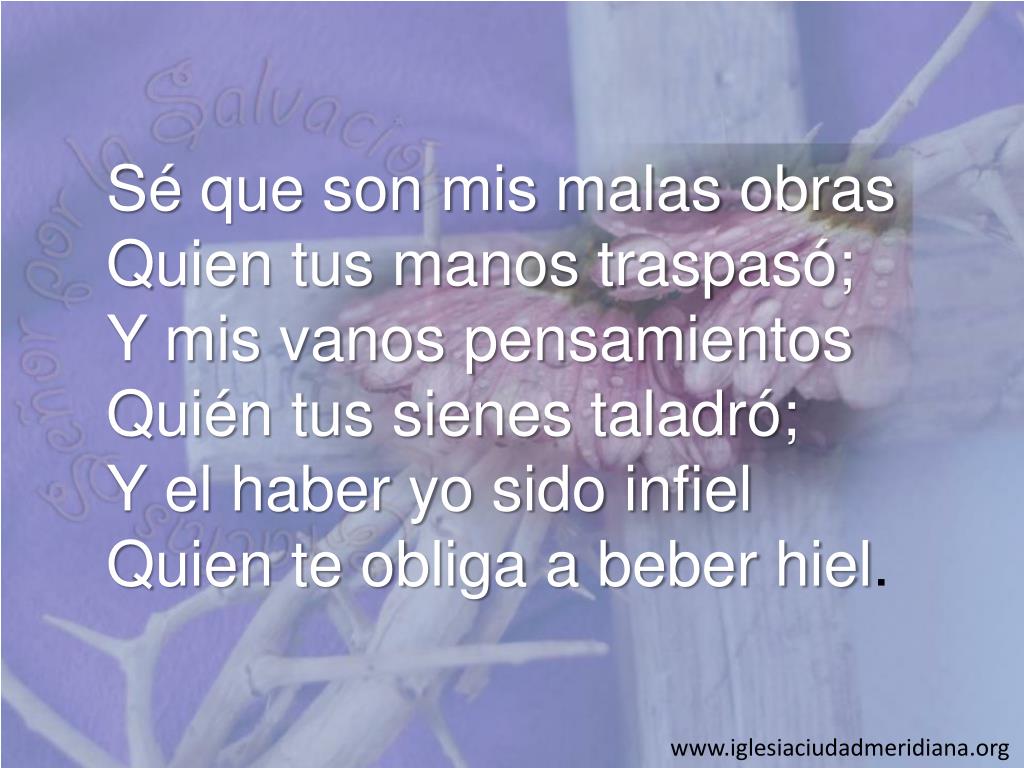 Sé que son mis malas obrasQuien tus manos traspasó;Y mis vanos pensamientosQuién tus sienes taladró;Y el haber yo sido infielQuien te obliga a beber hiel. www.iglesiaciudadmeridiana.org