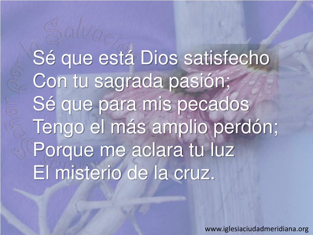 Sé que está Dios satisfechoCon tu sagrada pasión;Sé que para mis pecadosTengo el más amplio perdón;Porque me aclara tu luzEl misterio de la cruz. www.iglesiaciudadmeridiana.org