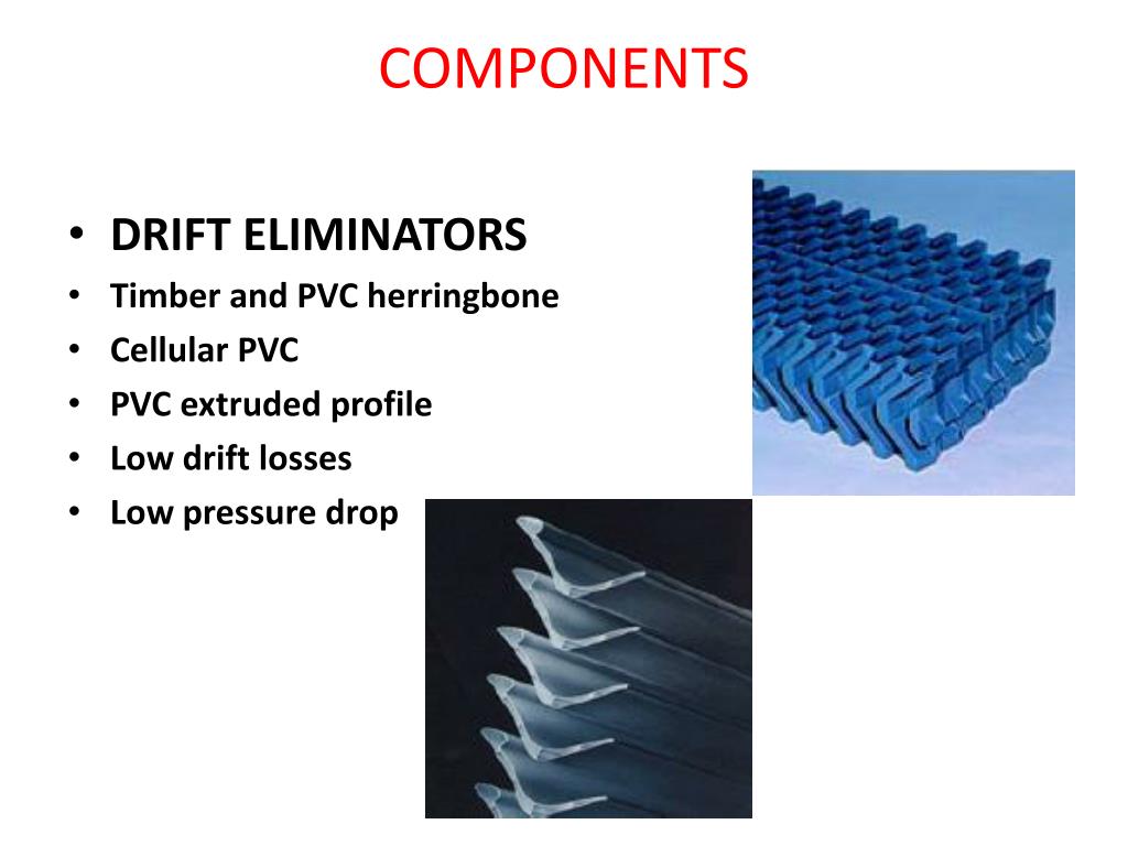 COMPONENTS • DRIFT ELIMINATORS • Timber and PVC herringbone • Cellular PVC • PVC extruded profile • Low drift losses • Low pressure drop