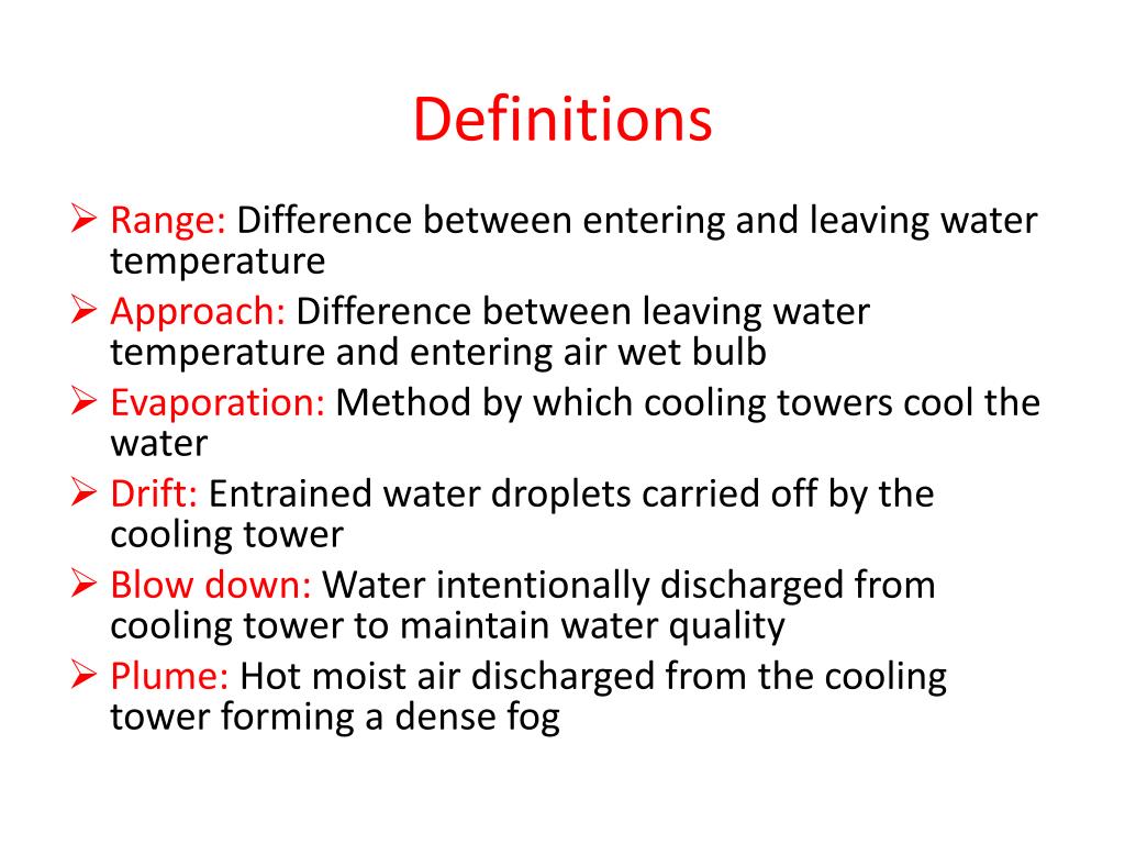 Definitions • Range: Difference between entering and leaving water temperature • Approach: Difference between leaving water temperature and entering air wet bulb • Evaporation: Method by which cooling towers cool the water • Drift: Entrained water droplets carried off by the cooling tower • Blow down: Water intentionally discharged from cooling tower to maintain water quality • Plume: Hot moist air discharged from the cooling tower forming a dense fog