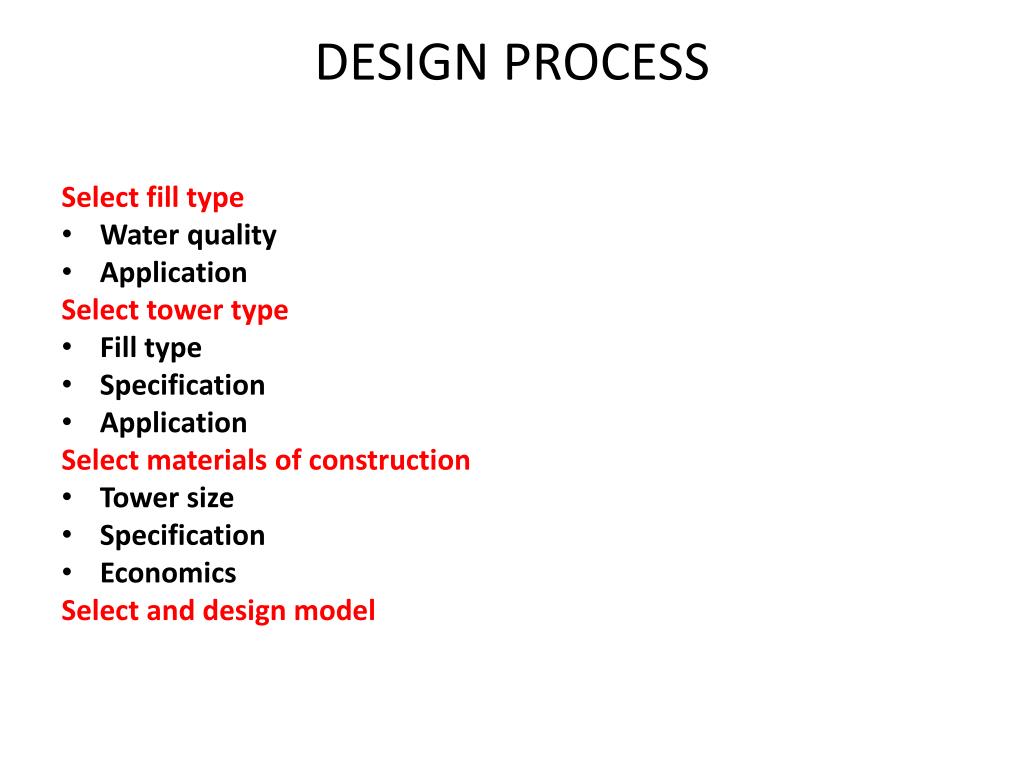 DESIGN PROCESS Select fill type • Water quality • Application Select tower type • Fill type • Specification • Application Select materials of construction • Tower size • Specification • Economics Select and design model