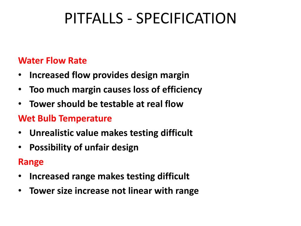 PITFALLS - SPECIFICATION Water Flow Rate • Increased flow provides design margin • Too much margin causes loss of efficiency • Tower should be testable at real flow Wet Bulb Temperature • Unrealistic value makes testing difficult • Possibility of unfair design Range • Increased range makes testing difficult • Tower size increase not linear with range