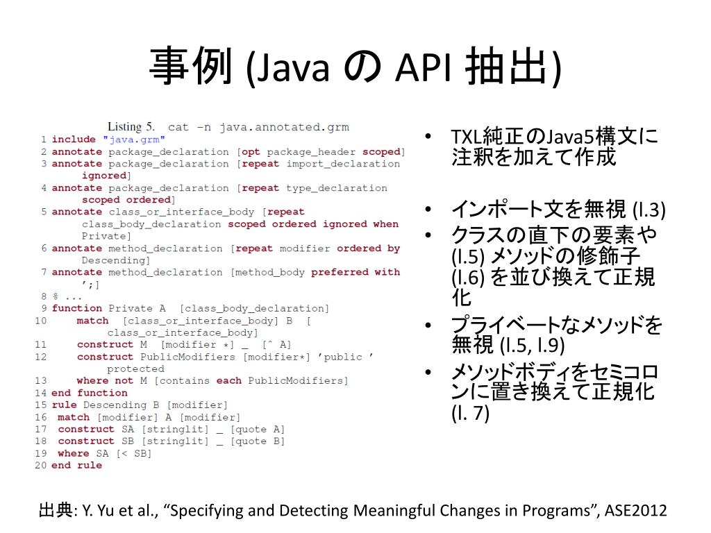 事例 (Java の API 抽出) • TXL純正のJava5構文に注釈を加えて作成 • インポート文を無視(l.3) • クラスの直下の要素や (l.5)メソッドの修飾子 (l.6) を並び換えて正規化 • プライベートなメソッドを無視 (l.5, l.9) • メソッドボディをセミコロンに置き換えて正規化 (l. 7) 出典: Y. Yu et al., “Specifying and DetectingMeaningful Changes in Programs”, ASE2012