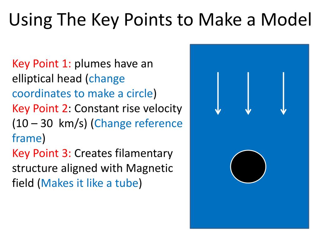 Using The Key Points to Make a Model Key Point 1: plumes have an elliptical head (change coordinates to make a circle) Key Point 2: Constant rise velocity (10 – 30 km/s) (Change reference frame) Key Point 3: Creates filamentary structure aligned with Magnetic field (Makes it like a tube)