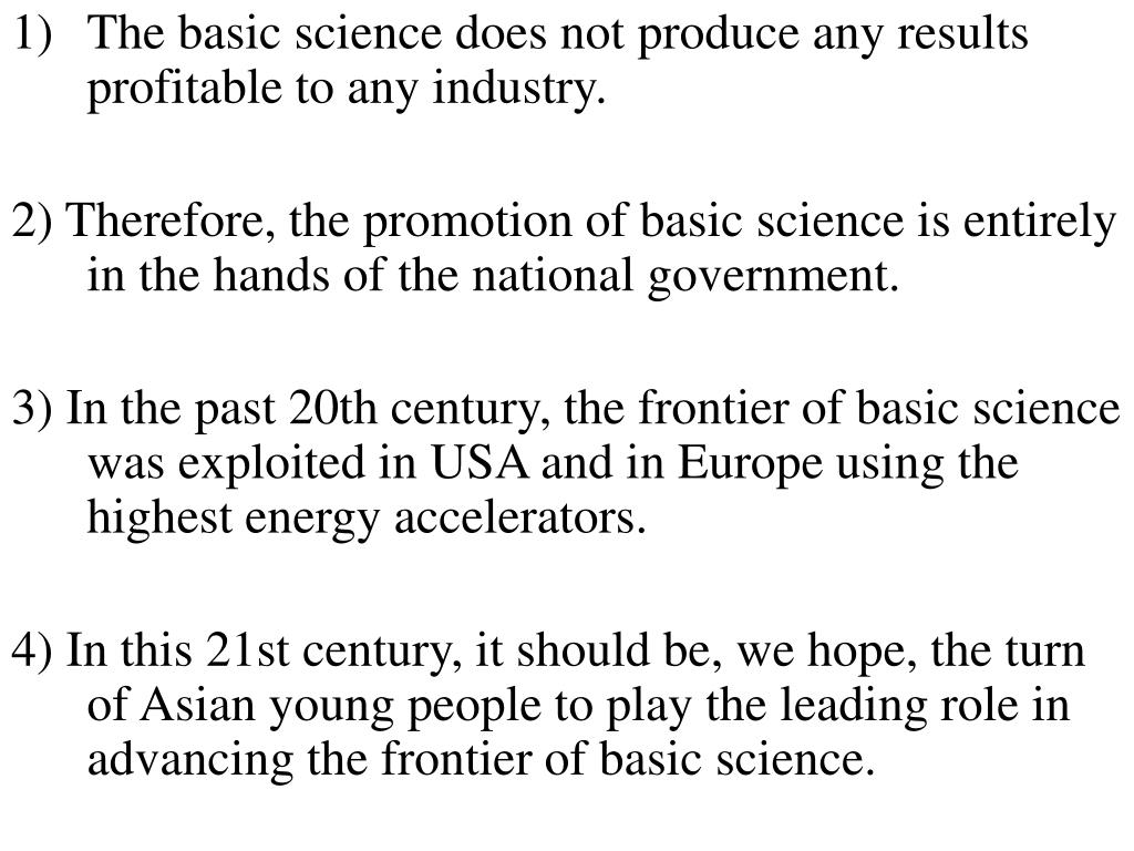 The basic science does not produce any results profitable to any industry. 2) Therefore, the promotion of basic science is entirely in the hands of the national government. 3) In the past 20th century, the frontier of basic science was exploited in USA and in Europe using the highest energy accelerators. 4) In this 21st century, it should be, we hope, the turn of Asian young people to play the leading role in advancing the frontier of basic science.