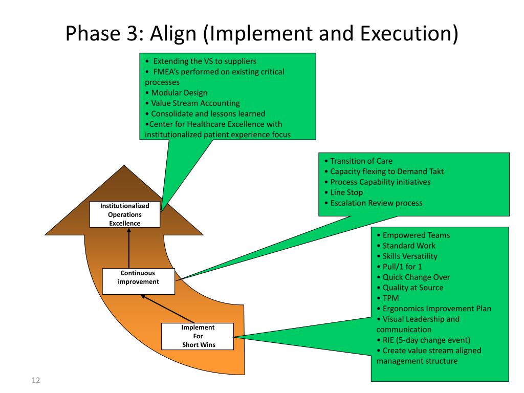 Phase 3: Align (Implement and Execution) • Extending the VS to suppliers • FMEA’s performed on existing critical processes • Modular Design • Value Stream Accounting • Consolidate and lessons learned • Center for Healthcare Excellence with institutionalized patient experience focus • Transition of Care • Capacity flexing to Demand Takt • Process Capability initiatives • Line Stop • Escalation Review process Institutionalized Operations Excellence • Empowered Teams • Standard Work • Skills Versatility • Pull/1 for 1 • Quick Change Over • Quality at Source • TPM • Ergonomics Improvement Plan • Visual Leadership and communication • RIE (5-day change event) • Create value stream aligned • management structure Continuous improvement Implement For Short Wins