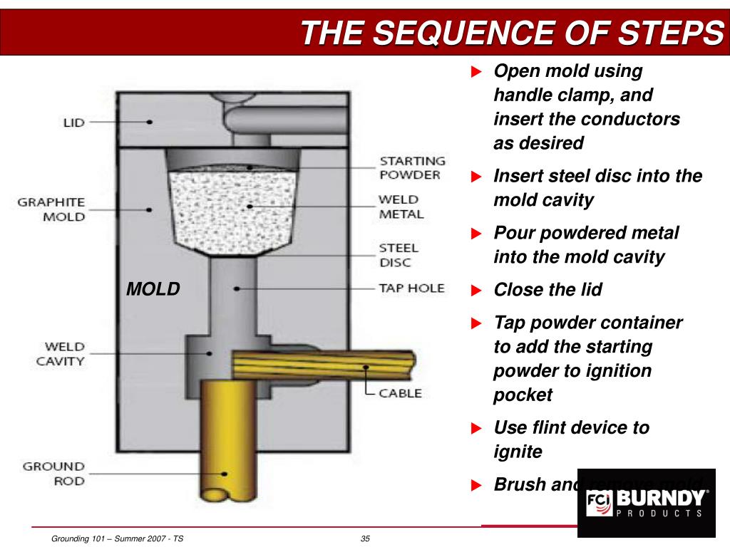 THE SEQUENCE OF STEPS • Open mold using handle clamp, and insert the conductors as desired • Insert steel disc into the mold cavity • Pour powdered metal into the mold cavity • Close the lid • Tap powder container to add the starting powder to ignition pocket • Use flint device to ignite • Brush and remove mold MOLD