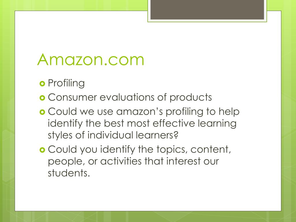 Amazon.com • Profiling • Consumer evaluations of products • Could we use amazon’s profiling to help identify the best most effective learning styles of individual learners? • Could you identify the topics, content, people, or activities that interest our students.