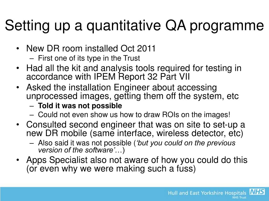 Setting up a quantitative QA programme • New DR room installed Oct 2011 • First one of its type in the Trust • Had all the kit and analysis tools required for testing in accordance with IPEM Report 32 Part VII • Asked the installation Engineer about accessing unprocessed images, getting them off the system, etc • Told it was not possible • Could not even show us how to draw ROIs on the images! • Consulted second engineer that was on site to set-up a new DR mobile (same interface, wireless detector, etc) • Also said it was not possible (‘but you could on the previous version of the software’…) • Apps Specialist also not aware of how you could do this (or even why we were making such a fuss)