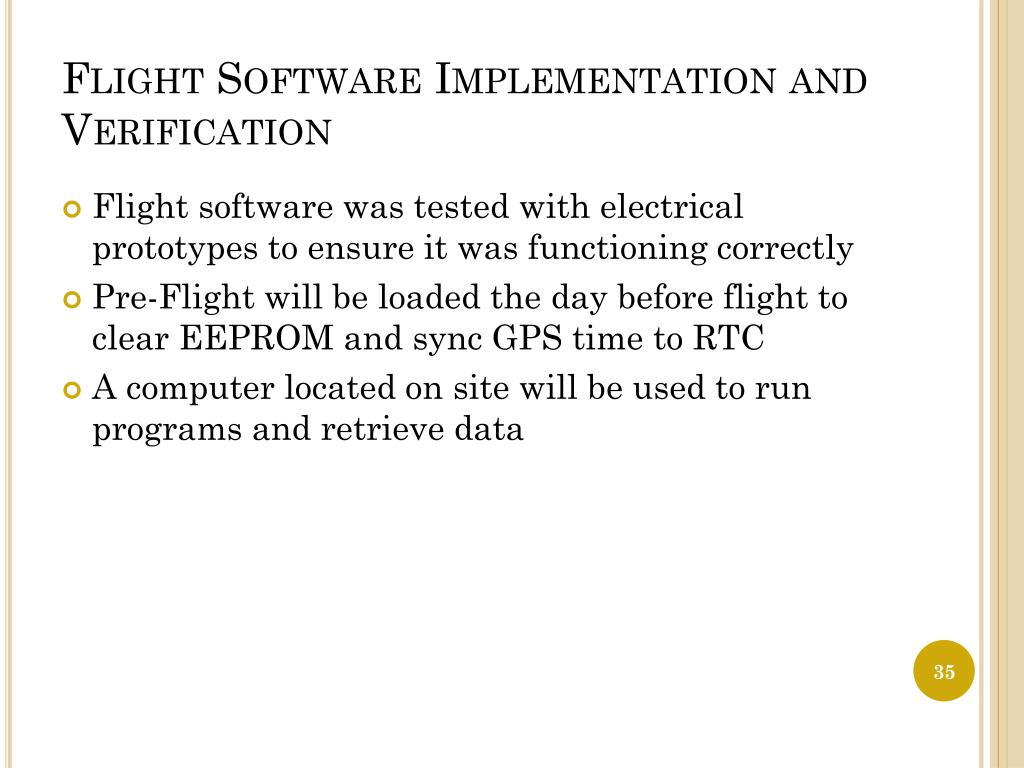 Flight Software Implementation and Verification • Flight software was tested with electrical prototypes to ensure it was functioning correctly • Pre-Flight will be loaded the day before flight to clear EEPROM and sync GPS time to RTC • A computer located on site will be used to run programs and retrieve data