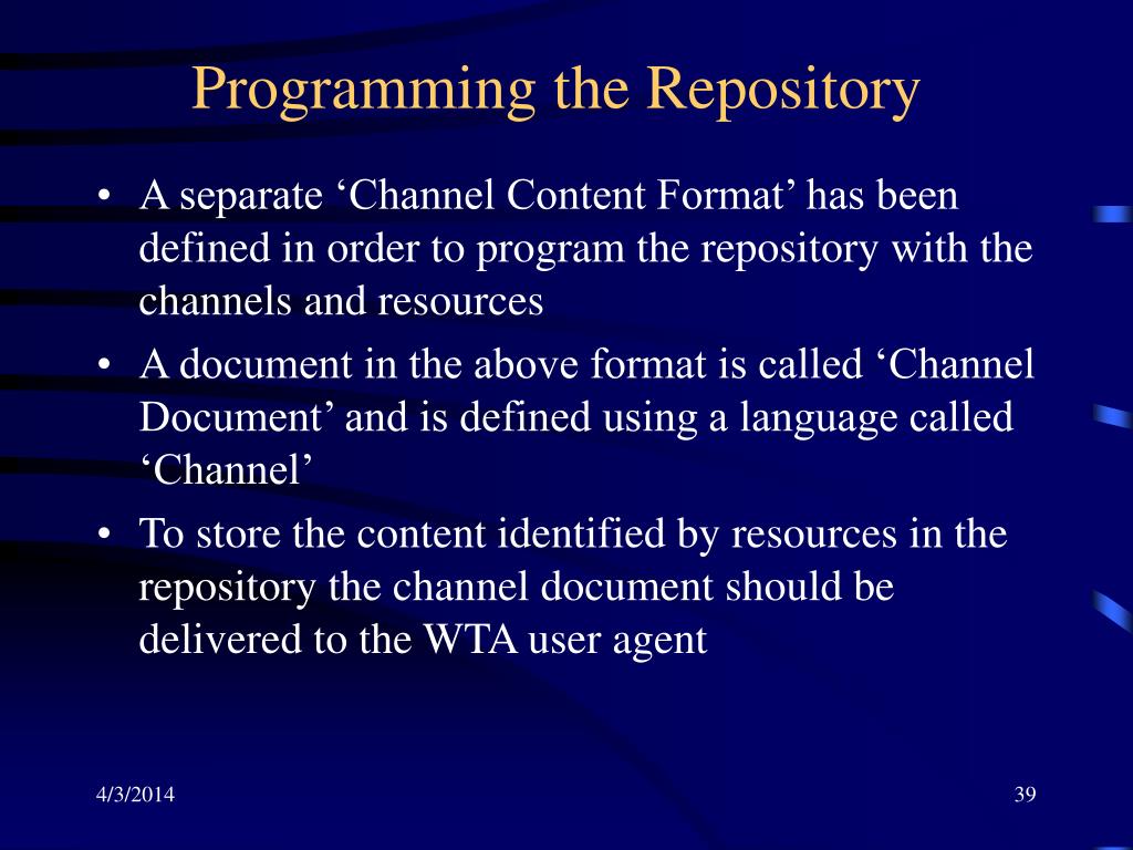 Programming the Repository • A separate ‘Channel Content Format’ has been defined in order to program the repository with the channels and resources • A document in the above format is called ‘Channel Document’ and is defined using a language called ‘Channel’ • To store the content identified by resources in the repository the channel document should be delivered to the WTA user agent