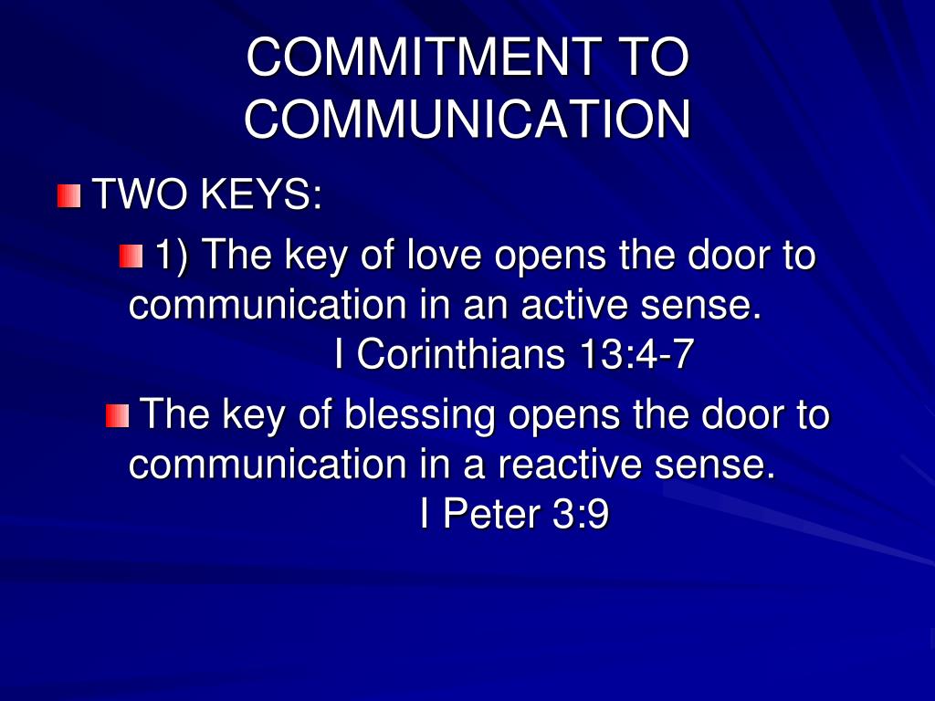 COMMITMENT TO COMMUNICATION • TWO KEYS: • 1) The key of love opens the door to communication in an active sense. I Corinthians 13:4-7 • The key of blessing opens the door to communication in a reactive sense. I Peter 3:9