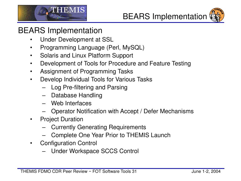BEARS Implementation • BEARS Implementation • Under Development at SSL • Programming Language (Perl, MySQL) • Solaris and Linux Platform Support • Development of Tools for Procedure and Feature Testing • Assignment of Programming Tasks • Develop Individual Tools for Various Tasks • Log Pre-filtering and Parsing • Database Handling • Web Interfaces • Operator Notification with Accept / Defer Mechanisms • Project Duration • Currently Generating Requirements • Complete One Year Prior to THEMIS Launch • Configuration Control • Under Workspace SCCS Control