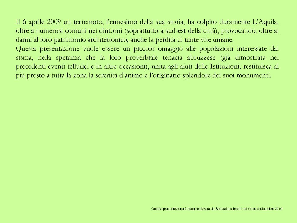 Il 6 aprile 2009 un terremoto, l’ennesimo della sua storia, ha colpito duramente L’Aquila, oltre a numerosi comuni nei dintorni (soprattutto a sud-est della città), provocando, oltre ai danni al loro patrimonio architettonico, anche la perdita di tante vite umane. Questa presentazione vuole essere un piccolo omaggio alle popolazioni interessate dal sisma, nella speranza che la loro proverbiale tenacia abruzzese (già dimostrata nei precedenti eventi tellurici e in altre occasioni), unita agli aiuti delle Istituzioni, restituisca al più presto a tutta la zona la serenità d’animo e l’originario splendore dei suoi monumenti. Questa presentazione è stata realizzata da Sebastiano Inturri nel mese di dicembre 2010