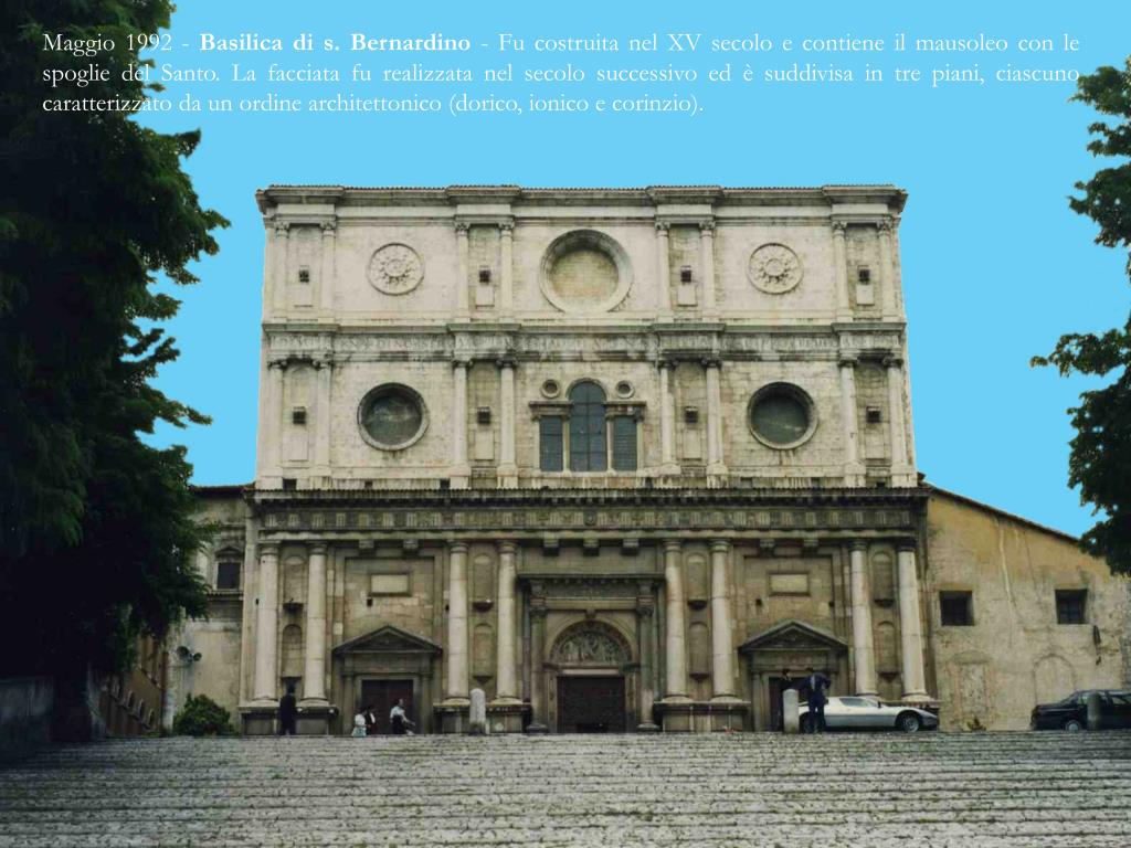 Maggio 1992 - Basilica di s. Bernardino - Fu costruita nel XV secolo e contiene il mausoleo con le spoglie del Santo. La facciata fu realizzata nel secolo successivo ed è suddivisa in tre piani, ciascuno caratterizzato da un ordine architettonico (dorico, ionico e corinzio).