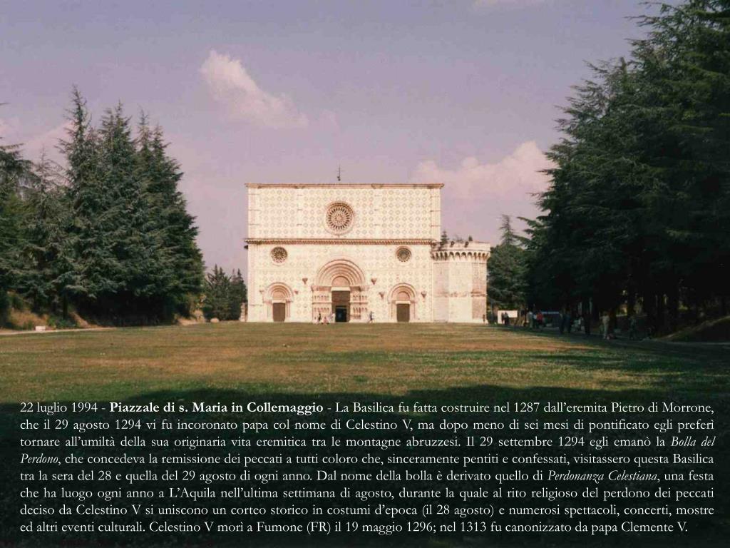 22 luglio 1994 - Piazzale di s. Maria in Collemaggio - La Basilica fu fatta costruire nel 1287 dall’eremita Pietro di Morrone, che il 29 agosto 1294 vi fu incoronato papa col nome di Celestino V, ma dopo meno di sei mesi di pontificato egli preferì tornare all’umiltà della sua originaria vita eremitica tra le montagne abruzzesi. Il 29 settembre 1294 egli emanò la Bolla del Perdono, che concedeva la remissione dei peccati a tutti coloro che, sinceramente pentiti e confessati, visitassero questa Basilica tra la sera del 28 e quella del 29 agosto di ogni anno. Dal nome della bolla è derivato quello di Perdonanza Celestiana, una festa che ha luogo ogni anno a L’Aquila nell’ultima settimana di agosto, durante la quale al rito religioso del perdono dei peccati deciso da Celestino V si uniscono un corteo storico in costumi d’epoca (il 28 agosto) e numerosi spettacoli, concerti, mostre ed altri eventi culturali. Celestino V morì a Fumone (FR) il 19 maggio 1296; nel 1313 fu canonizzato da papa Clemente V.