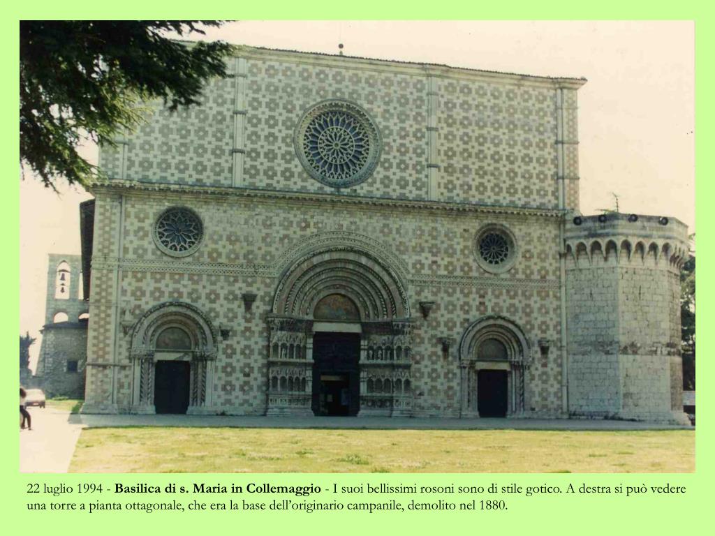 22 luglio 1994 - Basilica di s. Maria in Collemaggio - I suoi bellissimi rosoni sono di stile gotico. A destra si può vedere una torre a pianta ottagonale, che era la base dell’originario campanile, demolito nel 1880.