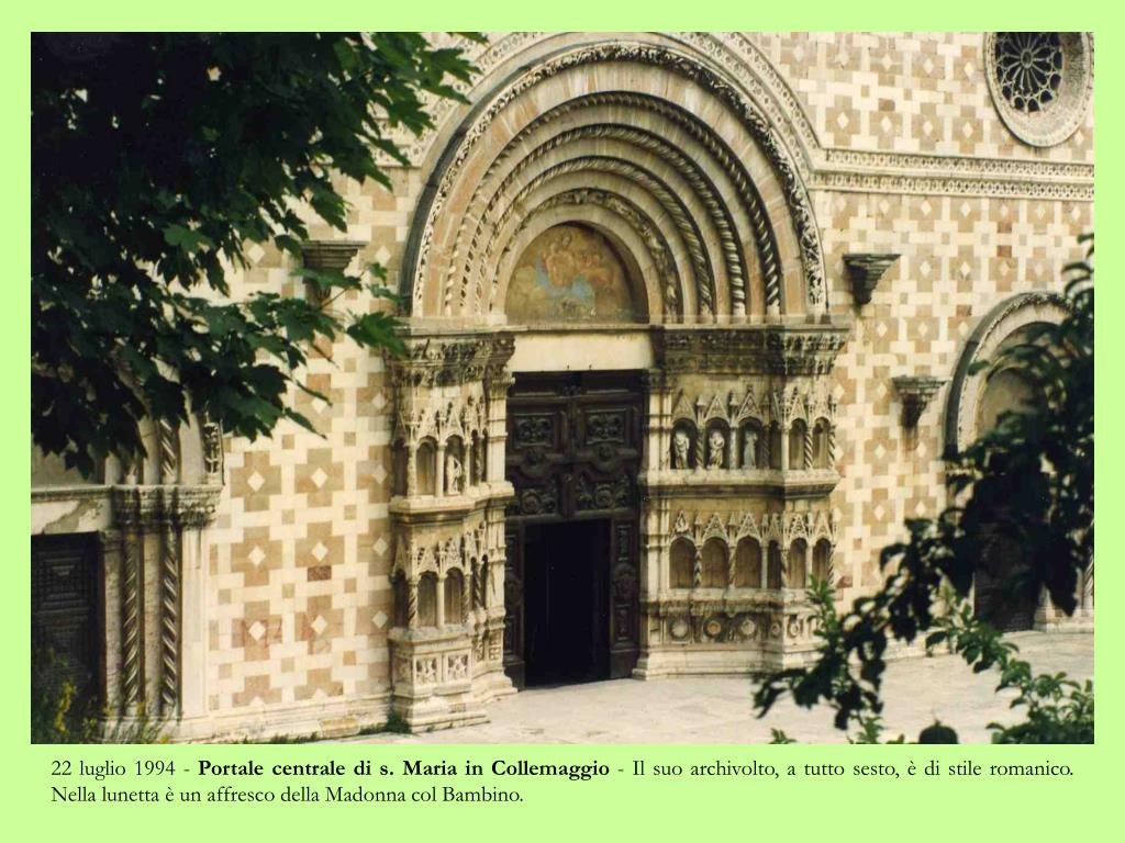 22 luglio 1994 - Portale centrale di s. Maria in Collemaggio - Il suo archivolto, a tutto sesto, è di stile romanico. Nella lunetta è un affresco della Madonna col Bambino.