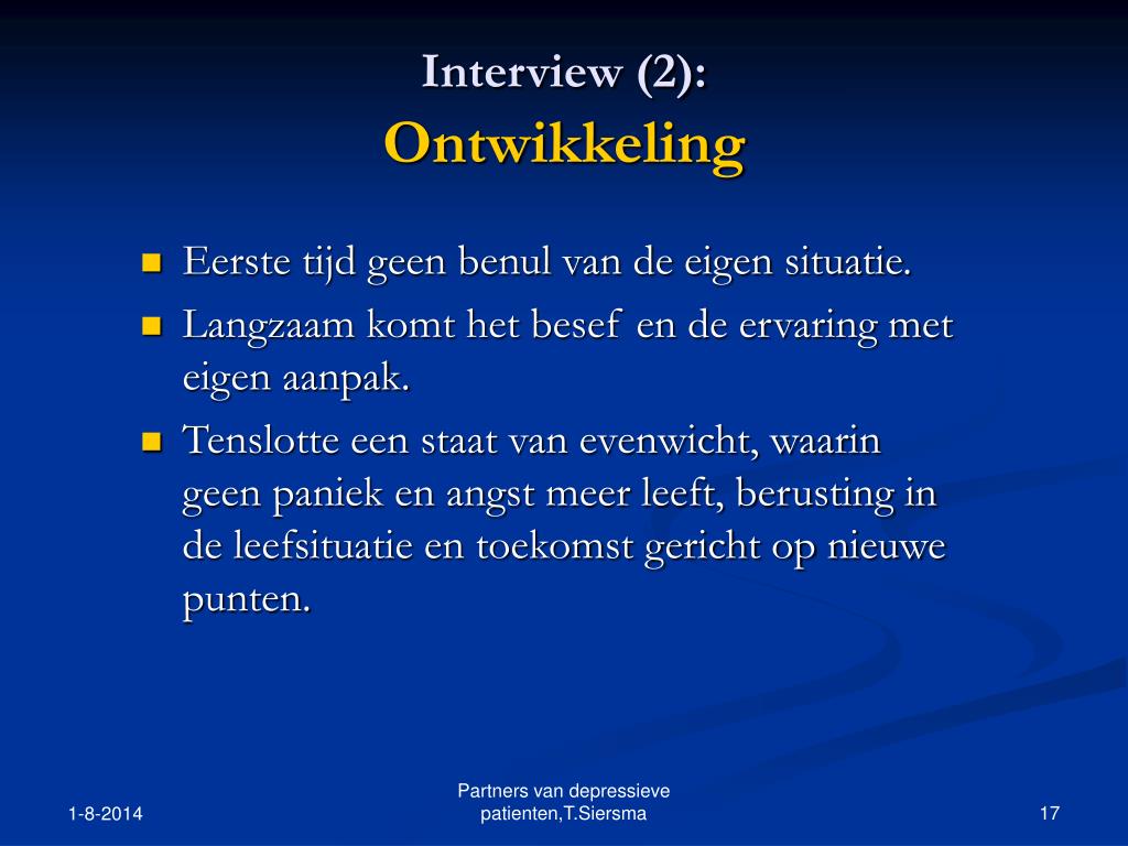 Interview (2):Ontwikkeling • Eerste tijd geen benul van de eigen situatie. • Langzaam komt het besef en de ervaring met eigen aanpak. • Tenslotte een staat van evenwicht, waarin geen paniek en angst meer leeft, berusting in de leefsituatie en toekomst gericht op nieuwe punten. Partners van depressieve patienten,T.Siersma