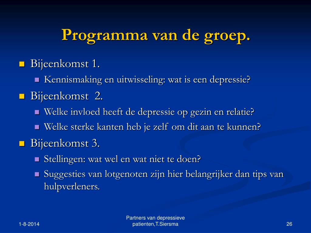 Programma van de groep. • Bijeenkomst 1. • Kennismaking en uitwisseling: wat is een depressie? • Bijeenkomst 2. • Welke invloed heeft de depressie op gezin en relatie? • Welke sterke kanten heb je zelf om dit aan te kunnen? • Bijeenkomst 3. • Stellingen: wat wel en wat niet te doen? • Suggesties van lotgenoten zijn hier belangrijker dan tips van hulpverleners. Partners van depressieve patienten,T.Siersma