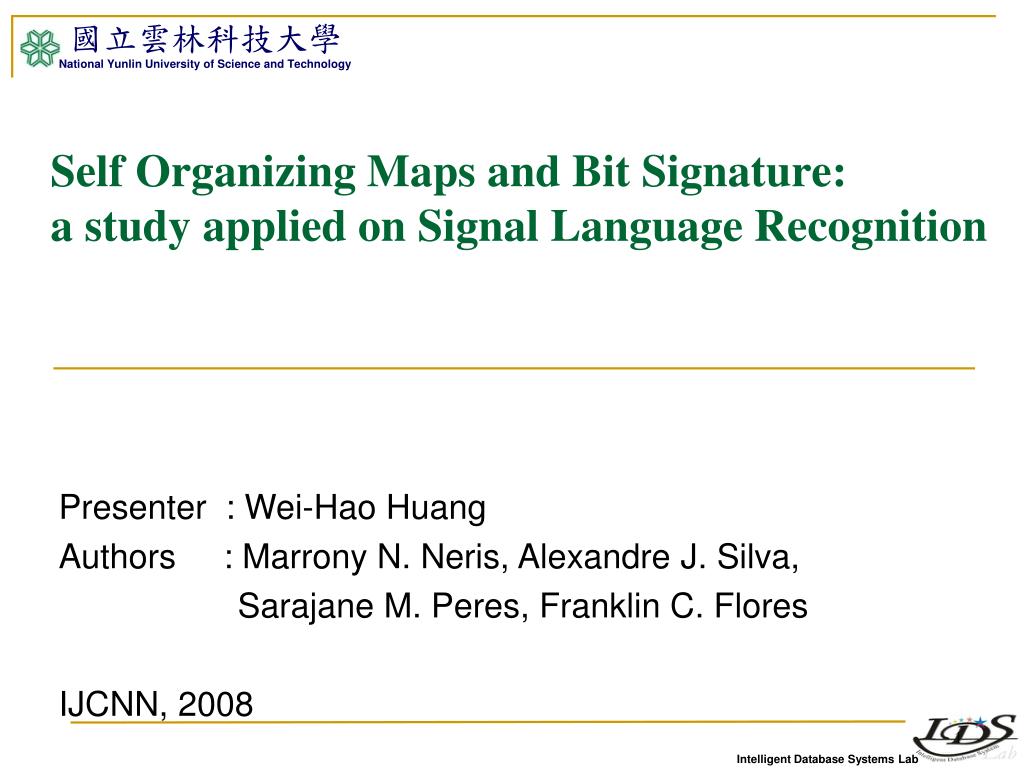 Self Organizing Maps and Bit Signature:a study applied on Signal Language Recognition Presenter : Wei-Hao Huang Authors : Marrony N. Neris, Alexandre J. Silva, Sarajane M. Peres, Franklin C. Flores IJCNN, 2008