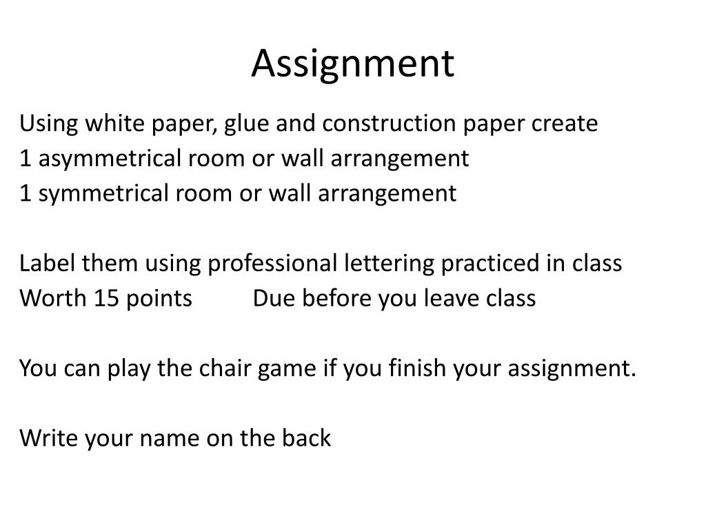 Assignment Using white paper, glue and construction paper create 1 asymmetrical room or wall arrangement 1 symmetrical room or wall arrangement Label them using professional lettering practiced in class Worth 15 points Due before you leave class You can play the chair game if you finish your assignment. Write your name on the back