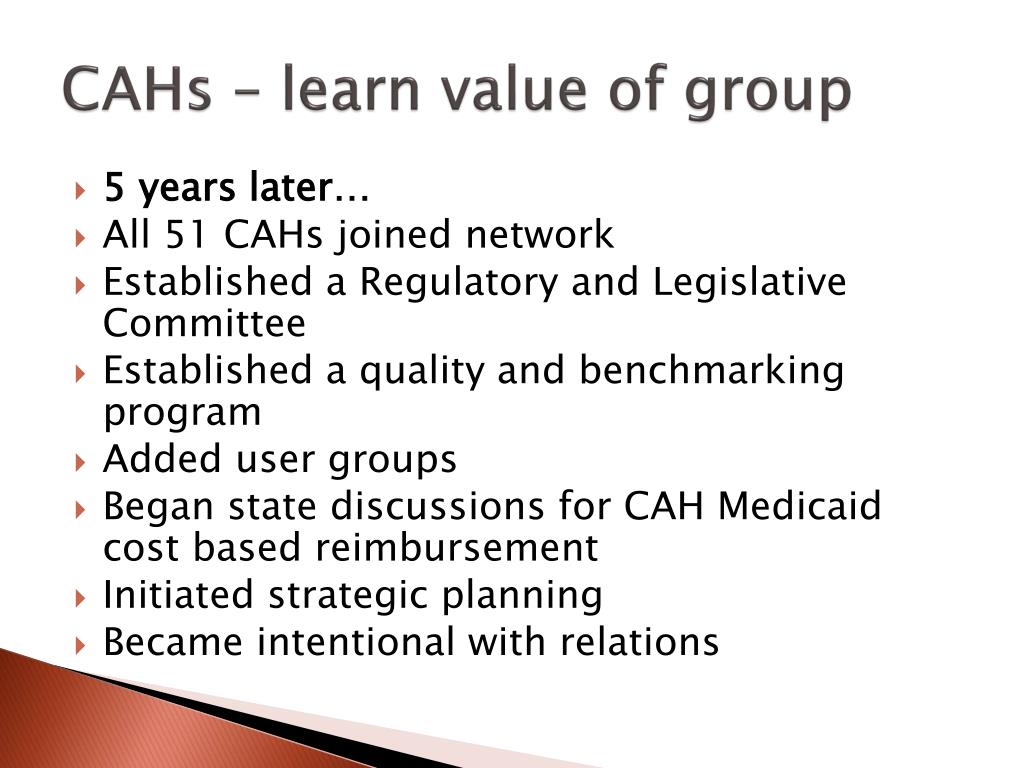 CAHs – learn value of group • 5 years later… • All 51 CAHs joined network • Established a Regulatory and Legislative Committee • Established a quality and benchmarking program • Added user groups • Began state discussions for CAH Medicaid cost based reimbursement • Initiated strategic planning • Became intentional with relations