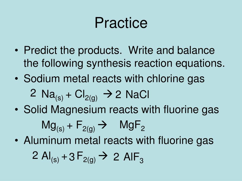 Practice • Predict the products. Write and balance the following synthesis reaction equations. • Sodium metal reacts with chlorine gas Na(s) + Cl2(g) • Solid Magnesium reacts with fluorine gas Mg(s) + F2(g) • Aluminum metal reacts with fluorine gas Al(s) + F2(g) 2 2 NaCl MgF2 2 3 2 AlF3