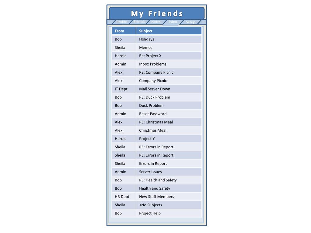 M y F r i e n d s Friends Notes Inbox Profile Setup Bob Jenkins Sheila Barkley Harold Smith Alex Mathews