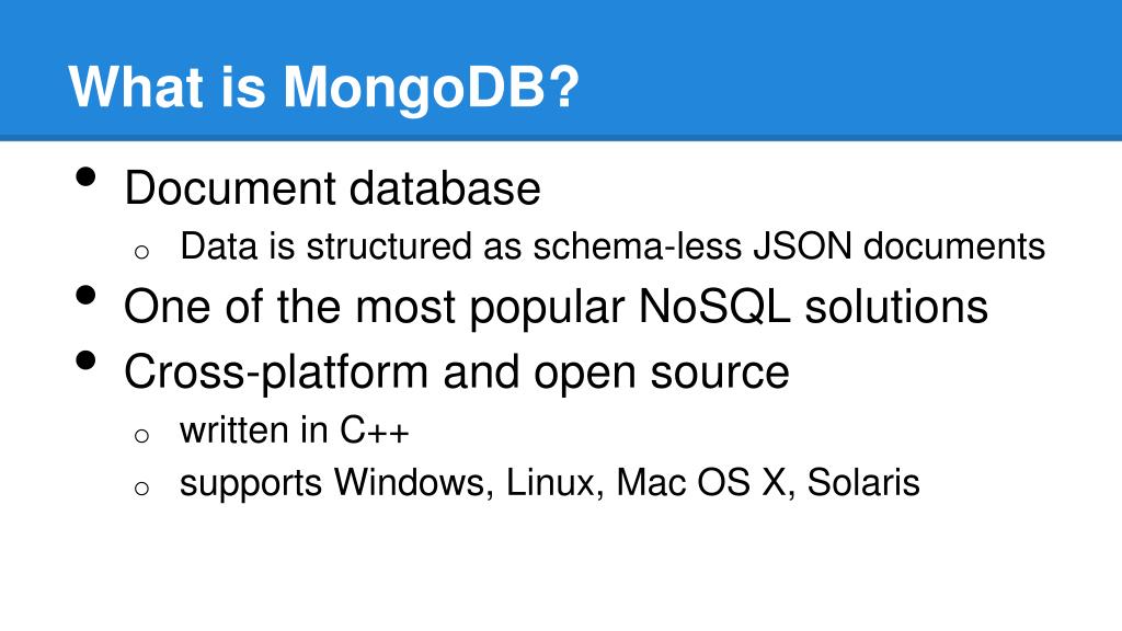 What is MongoDB? • Document database • Data is structured as schema-less JSON documents • One of the most popular NoSQL solutions • Cross-platform and open source • written in C++ • supports Windows, Linux, Mac OS X, Solaris
