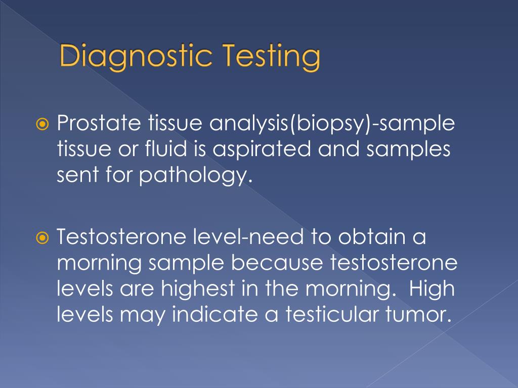 Diagnostic Testing • Prostate tissue analysis(biopsy)-sample tissue or fluid is aspirated and samples sent for pathology. • Testosterone level-need to obtain a morning sample because testosterone levels are highest in the morning. High levels may indicate a testicular tumor.
