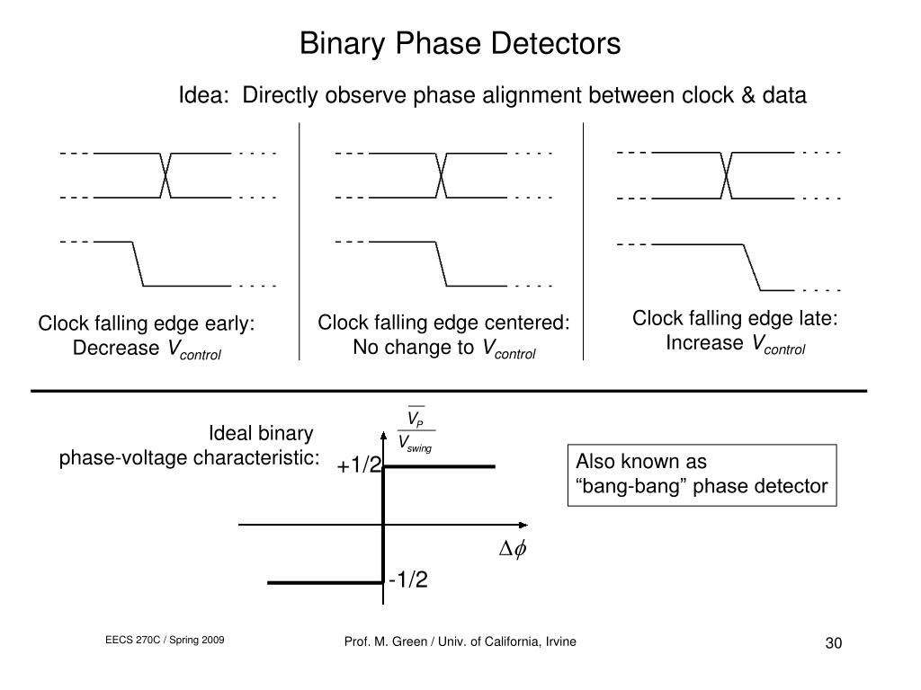 Ideal binary phase-voltage characteristic: Also known as “bang-bang” phase detector +1/2 -1/2 Binary Phase Detectors Idea: Directly observe phase alignment between clock & data Clock falling edge late: Increase Vcontrol Clock falling edge centered: No change to Vcontrol Clock falling edge early: Decrease Vcontrol Prof. M. Green / Univ. of California, Irvine