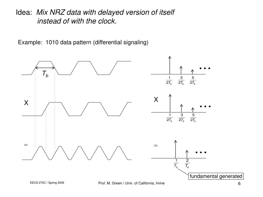 Idea: Mix NRZ data with delayed version of itself instead of with the clock. Example: 1010 data pattern (differential signaling) Tb X X = = fundamental generated Prof. M. Green / Univ. of California, Irvine