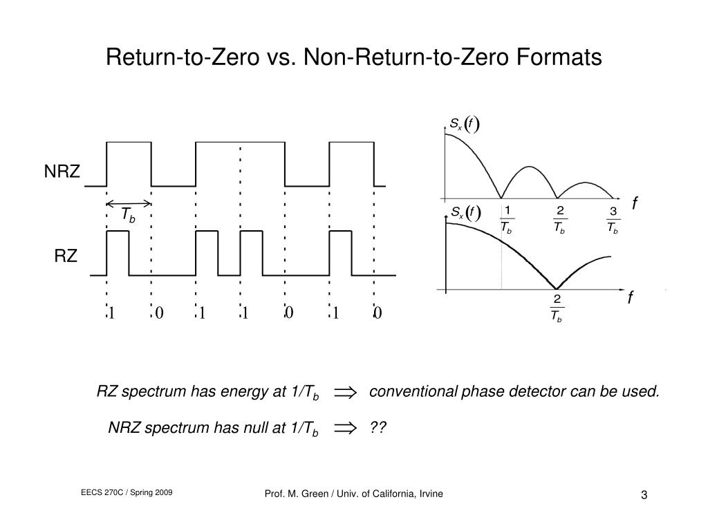f f RZ spectrum has energy at 1/Tb conventional phase detector can be used. NRZ spectrum has null at 1/Tb ?? Return-to-Zero vs. Non-Return-to-Zero Formats NRZ Tb RZ 0 1 0 1 1 1 0 Prof. M. Green / Univ. of California, Irvine