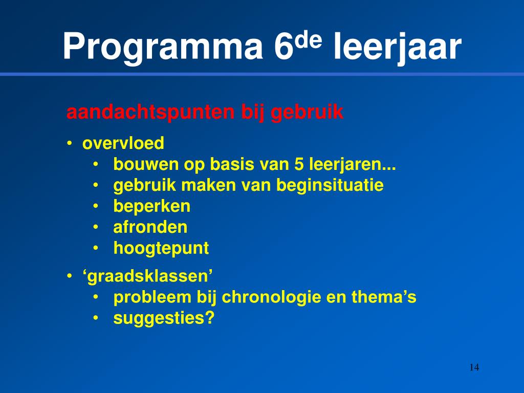 Programma 6deleerjaar aandachtspunten bij gebruik • overvloed • bouwen op basis van 5 leerjaren... • gebruik maken van beginsituatie • beperken • afronden • hoogtepunt • ‘graadsklassen’ • probleem bij chronologie en thema’s • suggesties?