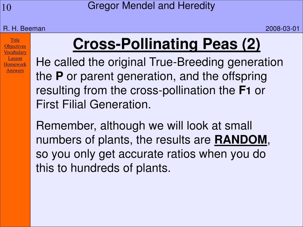 Cross-Pollinating Peas (2) He called the original True-Breeding generation the P or parent generation, and the offspring resulting from the cross-pollination the F1 or First Filial Generation. Remember, although we will look at small numbers of plants, the results are RANDOM, so you only get accurate ratios when you do this to hundreds of plants.