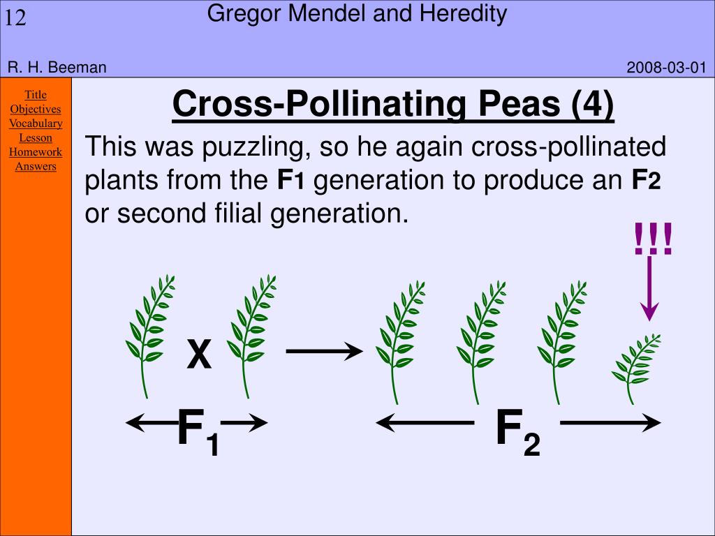 Cross-Pollinating Peas (4) This was puzzling, so he again cross-pollinated plants from the F1 generation to produce an F2 or second filial generation. !!! X F1 F2
