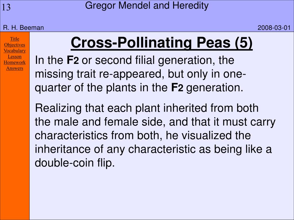 Cross-Pollinating Peas (5) In the F2 or second filial generation, the missing trait re-appeared, but only in one-quarter of the plants in the F2 generation. Realizing that each plant inherited from both the male and female side, and that it must carry characteristics from both, he visualized the inheritance of any characteristic as being like a double-coin flip.